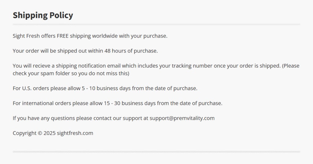 When you decide to purchase Sight Fresh, your order will be automatically shipped after you’ve filled in the order form and your payment is confirmed. In no more than 60 hours, you will receive an email with your shipping tracking ID and a personalized link that allows you to check your shipment anytime you like. After receiving this email, you can rest assured, as your order is on its way to you and will be delivered to the address you have provided as soon as possible.